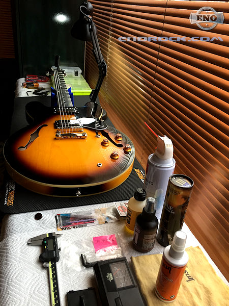 Let me start with Guitar Nut replacement. This is cheap and easy upgrade and you will see notable difference right away. Original Nut on this guitar is junk in my opinion. First of all, this is way too high, and second issue, these slots are too wide and too deep. Junk. But this is not big deal. You can get brand new guitar nut for $10 and this is fairly easy to replace. However you will need to sand this off to height you want. I am using Guitar Nut Sander with micro adjustment screws, so you can precisely adjust tilt (Low E / High E)  If you don't have this tool, this might be quite challenging to keep this 90-degree angle and flat surface, but this is doable at home :) By book you want 0.010" on Low E Side and 0.006" on High E Side, but you can experiment with these numbers. I also did fretwork; fret leveling, new radiuses and fret polishing. If you don't have right tools you can bring guitar to your local guitar shop and they will do it for you for about $200 Dollars.. and in my opinion, this guitar is worth this investment.